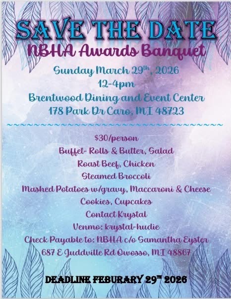 Don't forget to thank the businesses, organizations and individuals that have supported our MI NBHA shows. Without their support we would not have the added money and prizes. When possible make your purchases with these businesses and be sure to let them know how much we appreciate their support.