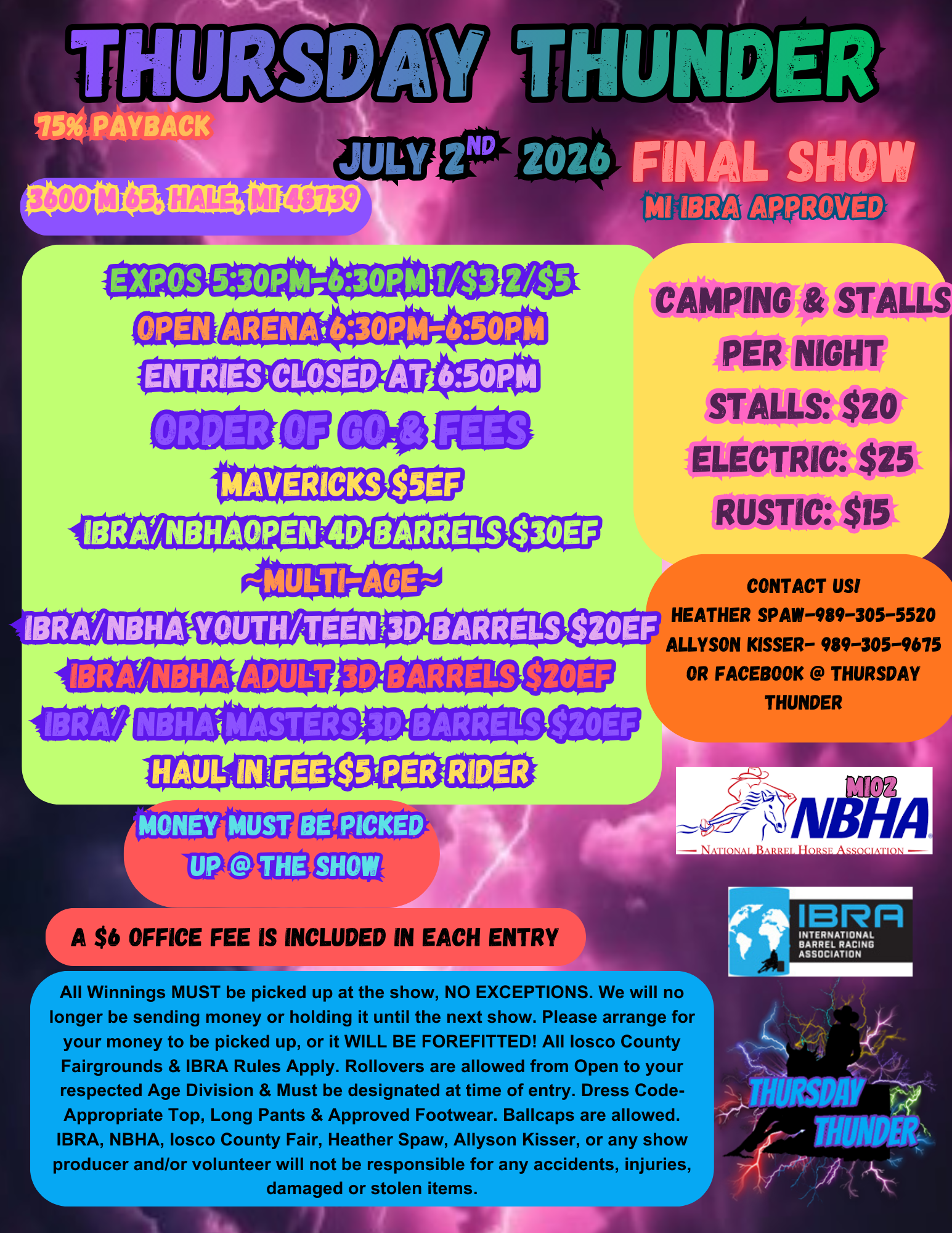 | July 2 | Thursday Thunder | Isoco County Fairgrounds 3716 M-65 Hale, MI 48739 | MI 02 IBRA |