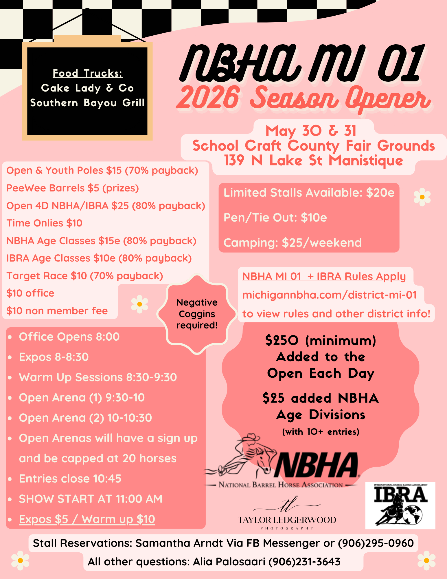 | May 30-31 | Season Opener Showbill Entry Form | Schoolcraft County Fairgrounds 139N Lake Street Manistique, MI 49854 | MI 01 |
